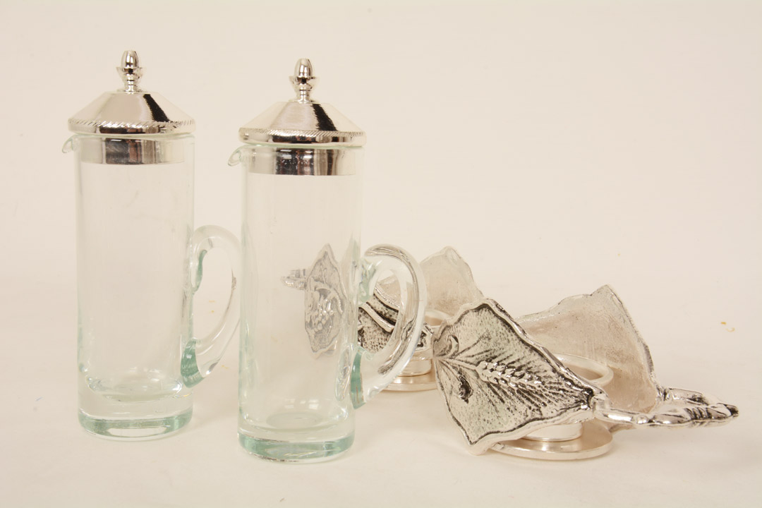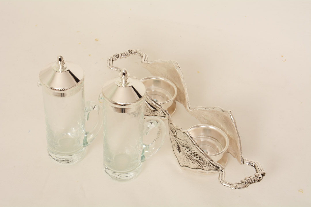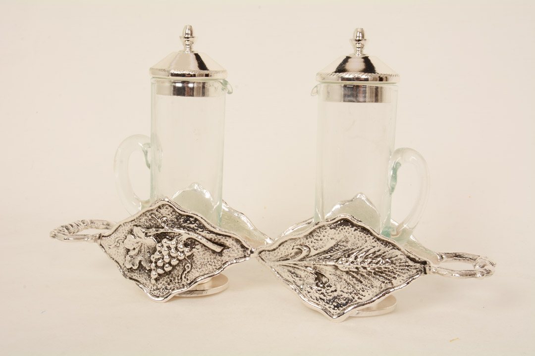 Servizio ampolle a cilindro con tappi e base in ottone con fusione simboli uva e spighe.