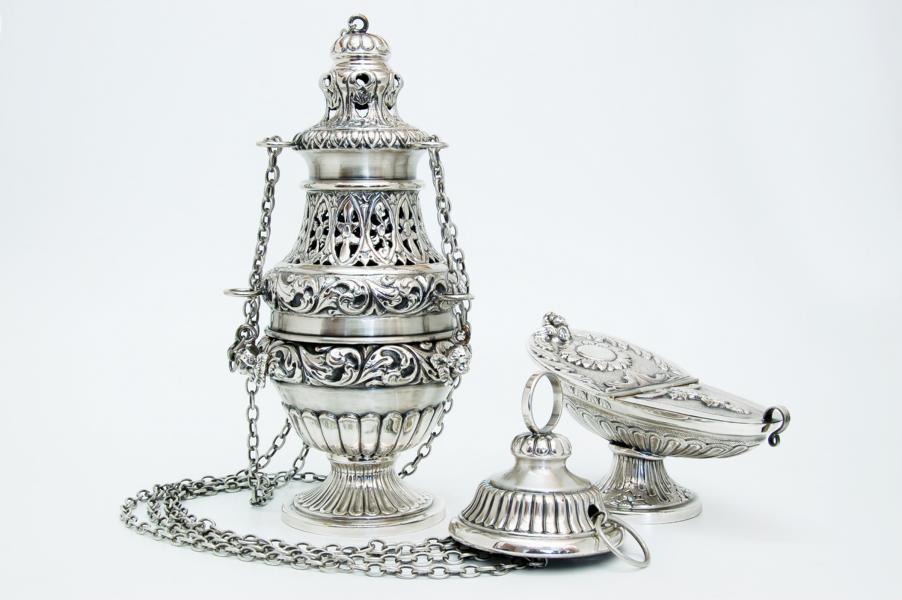Turibolo in metallo argentato cesellato, completo di navicella.