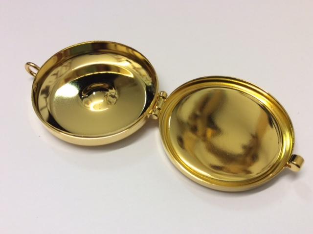 Teca eucaristica in metallo dorato, completa di anello per essere portata al collo.