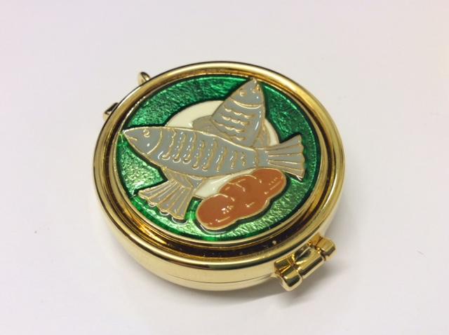 Teca eucaristica in metallo dorato, completa di anello per essere portata al collo.