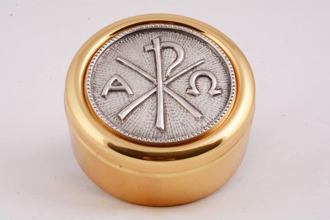 Teca eucaristica grande con monogramma di Cristo, Alfa e Omega.