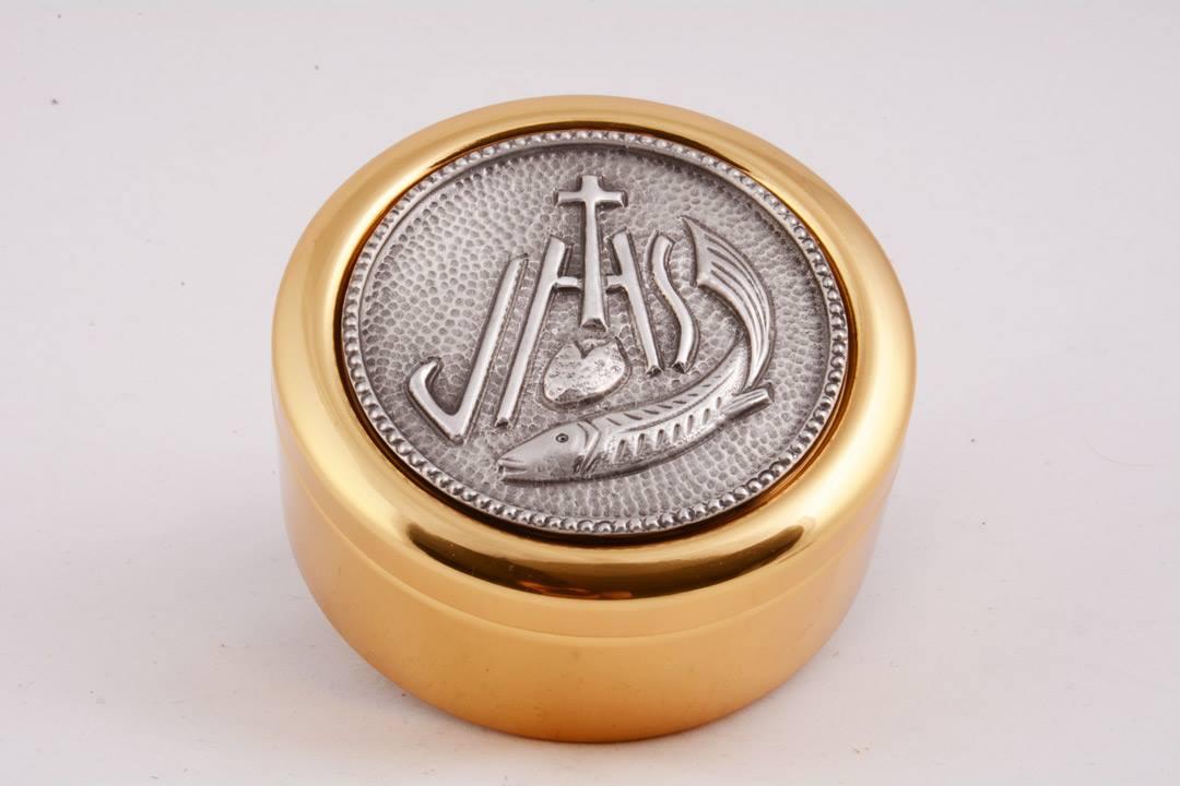 Teca eucaristica grande con monogramma IHS e immagine del pane e pesce.