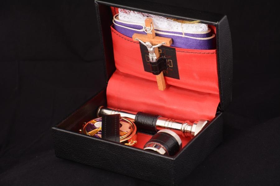 Astuccio rigido a scatto contenente croce, teca, vasetto, asperges, purifichino, stola.