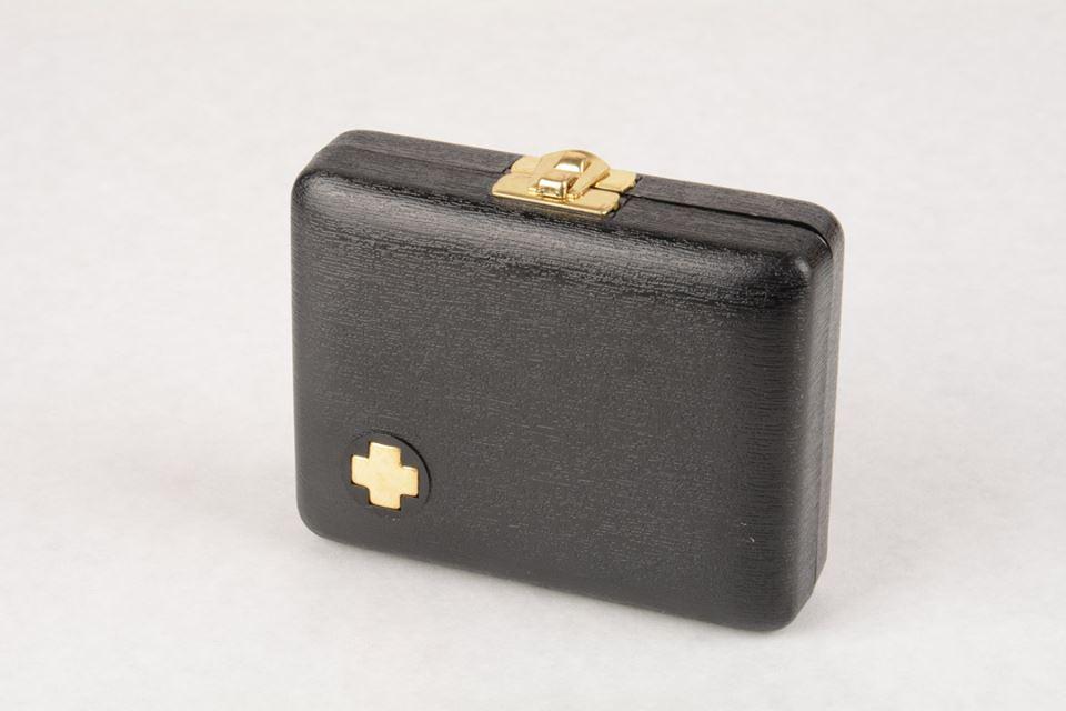 Piccolo astuccio rigido, esternamente nero, raso rosso all'interno.