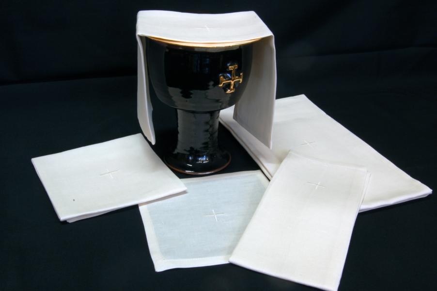 In lino ecrù con ricamata croce semplice. Composto da quattro pezzi: corporale, manutergi, purificatoio, animetta.
