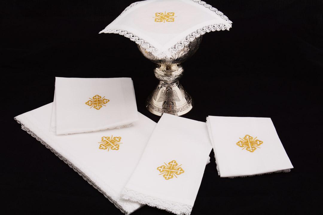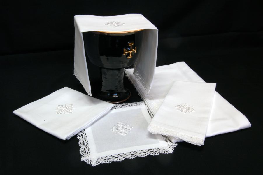 In misto lino con pizzetto con ricamata croce trilobata in bianco o in oro. Composto da cinque pezzi: amitto, corporale, manutergi, purificatoio, animetta.