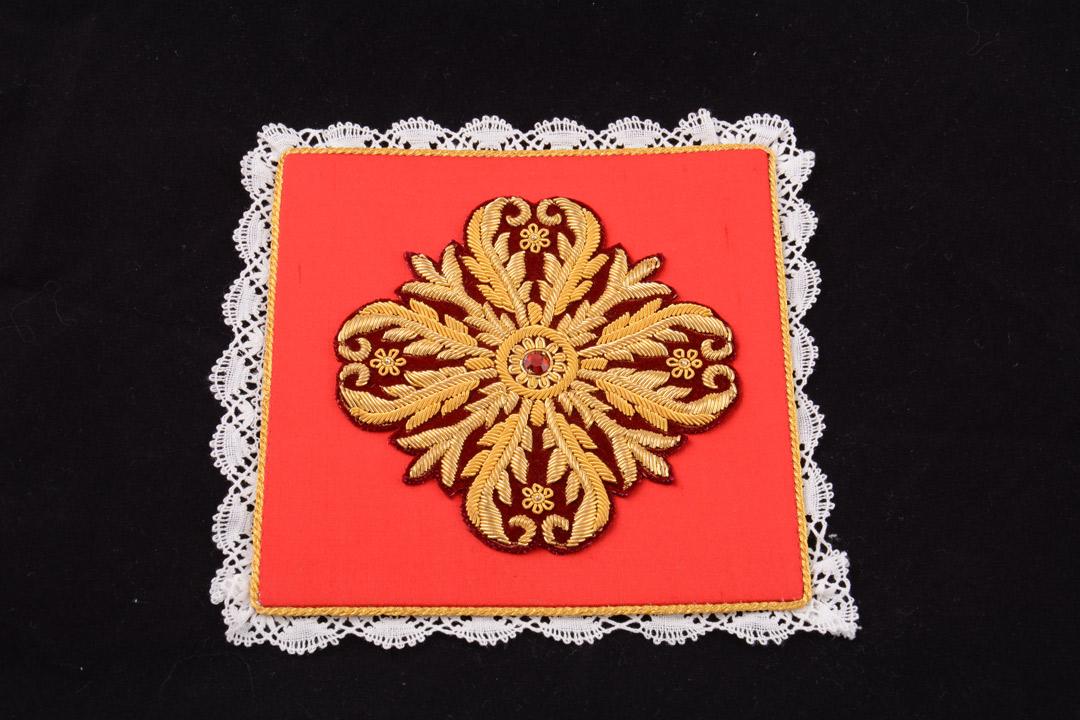 La palla è un piccolo quadrato di lino con decorazioni eseguite su seta, utilizzato per coprire il calice, specialmente dall’Offertorio alla Comunione.
