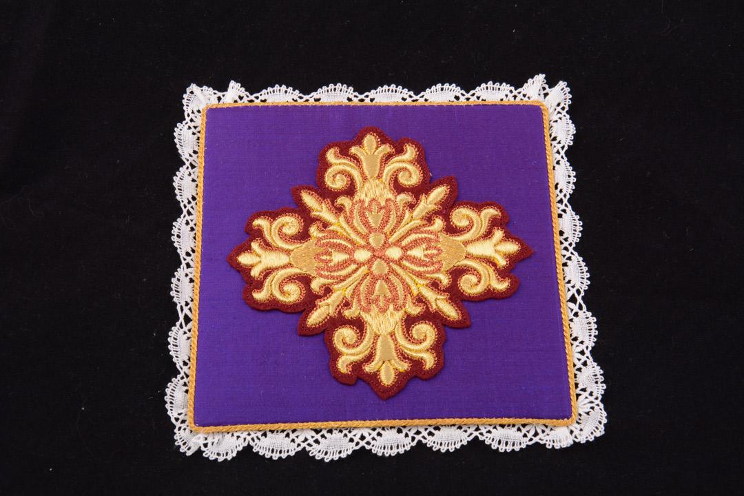 La palla è un piccolo quadrato di lino con decorazioni eseguite su seta, utilizzato per coprire il calice, specialmente dall’Offertorio alla Comunione.