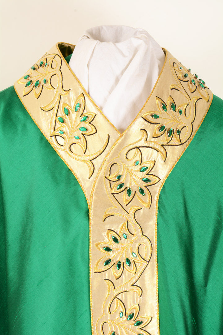 Taglio classico molto ampio e rotondeggiante. Il collo, che dona maestosità alla veste. Dimensioni molto generose per dare importanza alla figura del sacerdote. Tutti i modelli possono essere realizzati in tutti i colori liturgici.